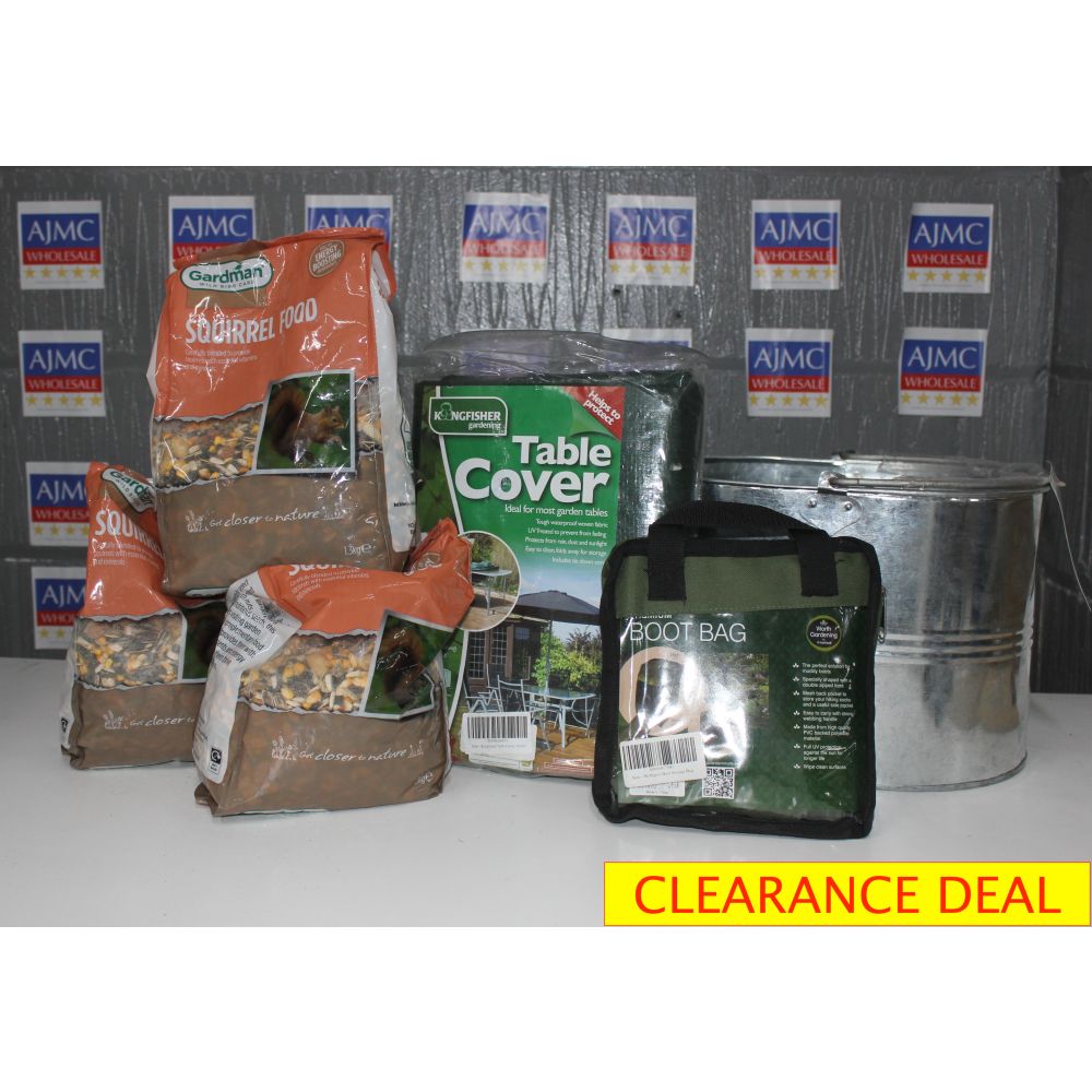 Clearance Deal: Mix of 6 Different Home Products: Squirrel food, table covers, boot bag and buckets